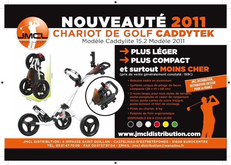En exclusivité, présentation au salon du Golf 2011, le nouveau chariot CADDYTEK 2011, plus compact, plus léger, nouvelle poignée de frein plus ergonomique, le meilleur rapport qualité/prix du marché (159 euros TTC, prix de vente public, liste des revendeurs sur demande).